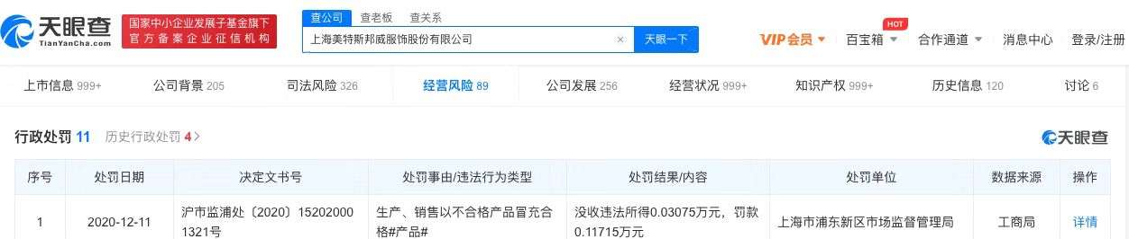 天眼查App显示,近日,上海美特斯邦威服饰股份有限公司新增一条行政处罚信息,处罚事由为生产、销售以不合格产品冒充合格产品 ,处罚结果为没收违法所得0.03075万元,罚款0.11715万元 ,决定机关为上海市浦东新区市场监督管理局。
