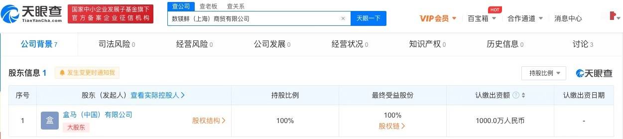 天眼查App显示,12月24日,数镁鲜(上海)商贸有限公司成立,法定代表人为赵家钰,注册资本1000万人民币,公司经营范围包含:食品经营;第三类医疗器械经营;道路货物运输(不含危险货物);货物进出口;技术进出口等。该公司由盒马(中国)有限公司100%持股。