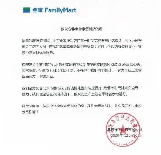 北京顶全便利有限公司发布声明称,北京全家便利店已完成全部门店消杀,今日(30日)在相关门店的人员、商品和环境等核酸检测结果皆为阴性,今起陆续恢复营业。