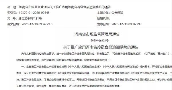 龙商网消息:12月30日,河南省市场监督管理局发布关于《推广应用河南省冷链食品追溯系统的通告》。