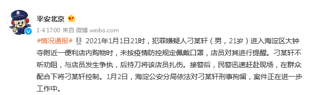 龙商网消息: 1月1日21时,犯罪嫌疑人刁某轩(男,21岁)进入海淀区大钟寺附近一便利店内购物时,未按疫情防控规定佩戴口罩,店员对其进行提醒。刁某轩不听劝阻,与店员发生争执,后持刀将该店员扎伤。接警后,民警迅速赶赴现场,在群众配合下将刁某轩控制。...