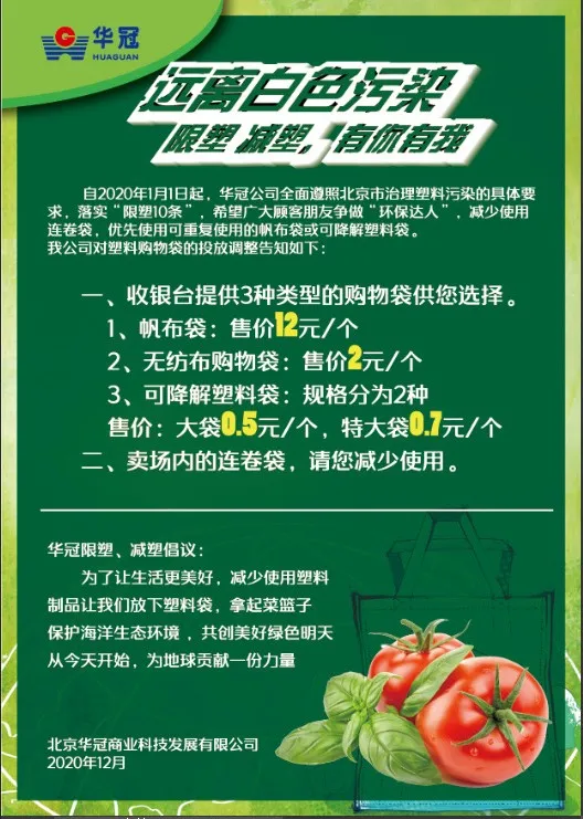 据了解,华冠公司自北京“限塑10条”征求意见稿发布开始,就已经开始着手联系供应商准备塑料袋替换等相关事项,并于北京最新“限塑令”颁布之后,全面推行使用可降解塑料袋、无纺布购物袋以及帆布袋来替换原有塑料袋。自2021年1月1日起,已完成全面替换工作,并通过在显眼位置张贴宣传标语、店内广播宣传等形式,推荐消费者自带袋子或在店内购买新的可降解购物袋。