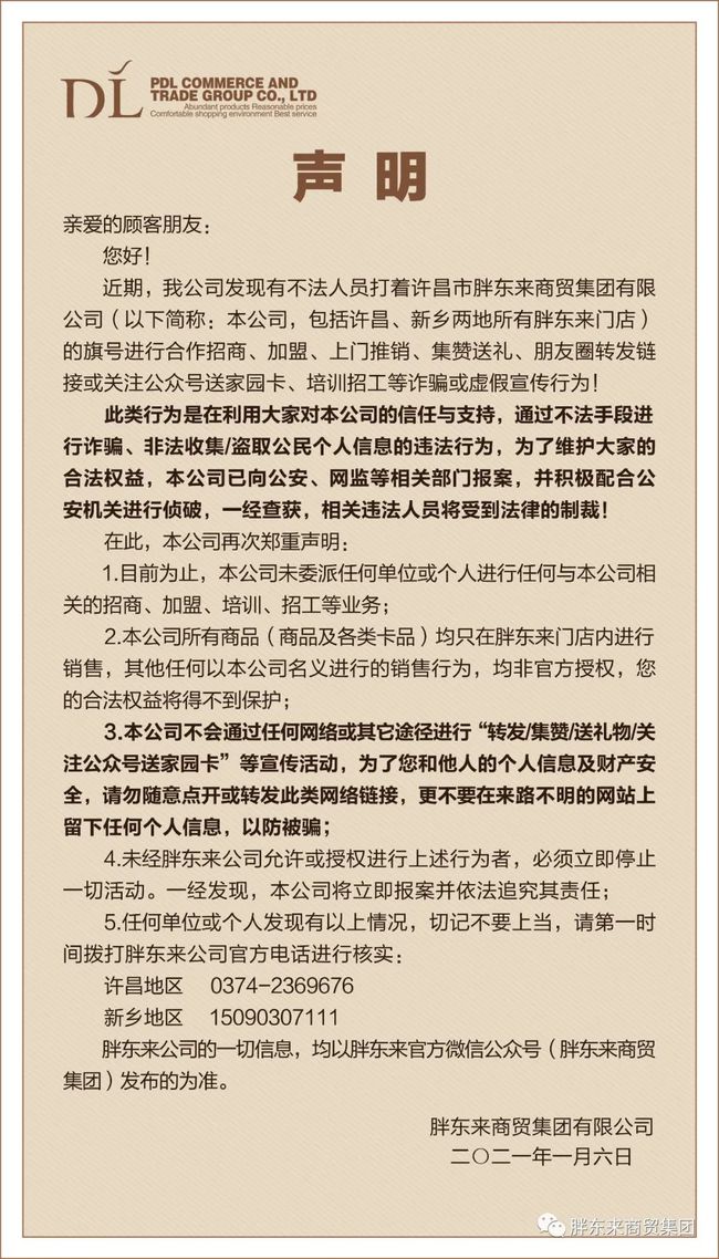 龙商网消息: 1月6日,胖东来商贸集团发布声明表示:目前为止,本公司未委派任何单位或个人进行任何与本公司相关的招商、加盟、培训、招工等业务。