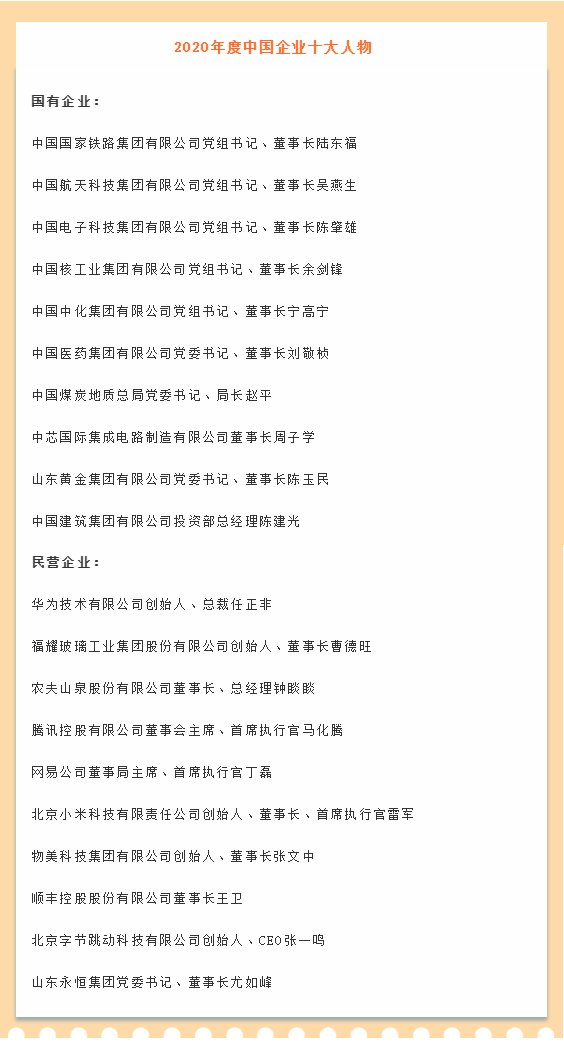 本次活动发布了“2020年度中国企业十大新闻”等榜单。《2020年度中国企业十大新闻》包括:1.中国企业掀起学习贯彻十九届五中全会精神热潮,投入全面建设社会主义现代化国家新征程;2.全国企业界积极抗疫复产,为中国成为全球唯一正增长主要经济体做出巨大贡献;3.中国国有企业积极落实国企改革三年行动方案,坚持和加强党对国有企业全面领导;4.中国民营企业勇担市场主体责任,借力中央减税降费优惠政策战胜疫情焕发活力;5.中国企业科技创新捷报频传,奔月取壤、入海深潜、九章问世、北斗组网等成就举世瞩目;6.中国企业积极参与新冠疫苗攻关,国药集团、科兴生物等勇担责任造福国人;7.中国芯片企业迎重磅利好,华为、中芯国际等企业面对美国“制裁”迎难而上;8.中国企业向全球展示中国速度,火神山医院、雷神山医院横空出世;9.中国企业积极参与新基建,5G基建、人工智能、新能源等七大领域成为创新发力点;10.中国电子商务龙头企业积极配合反垄断,确保平台经济健康发展。