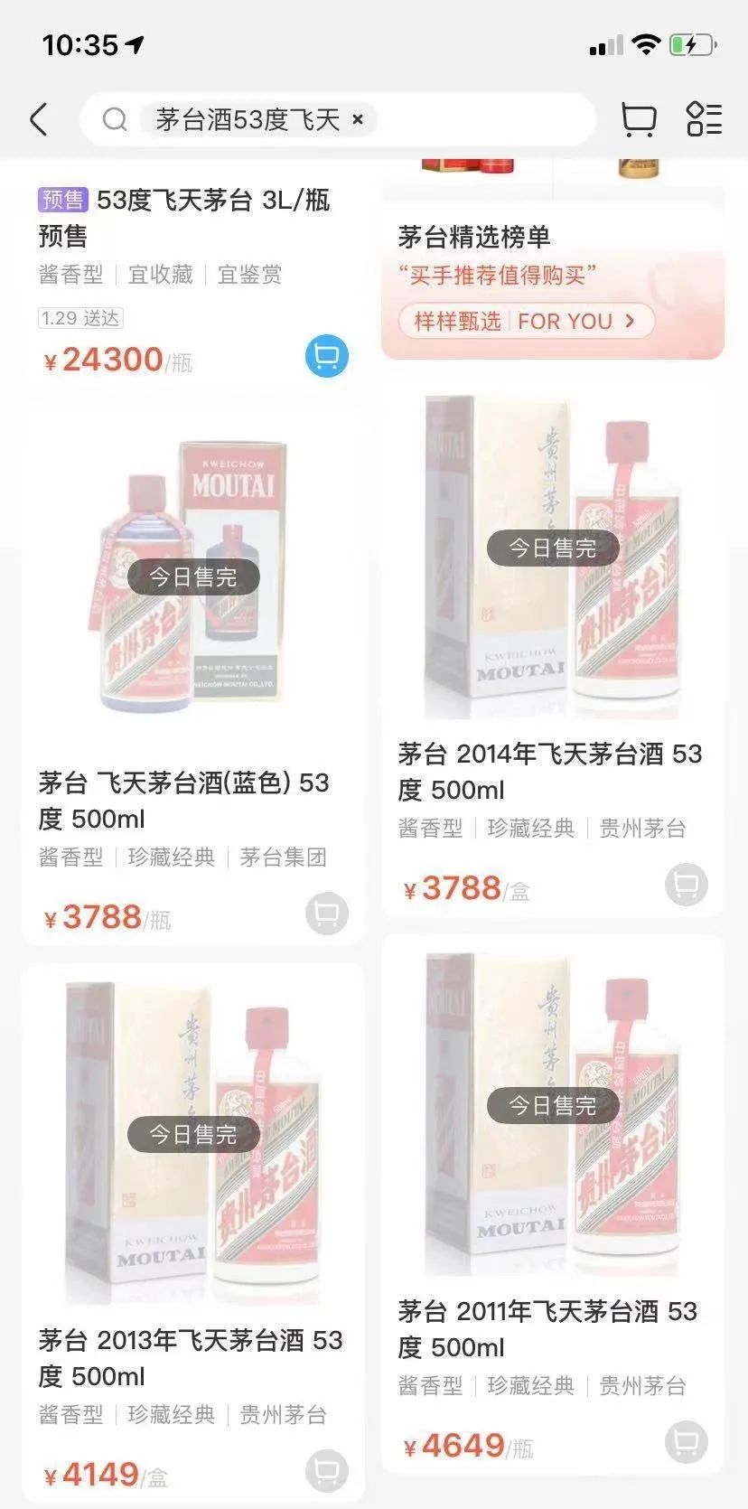 目前上海地区已难觅飞天茅台的踪迹。1月26日近21点,盒马页面显示,2016年53度500ml的飞天茅台酒售价为4299元,2019年的售价为3699元,均为明日送达;但不到1个小时后,记者发现,盒马已下架了相关产品。此外,同一时间,记者从上海黄浦区一家烟酒店老板获悉,目前飞天茅台有货,且可整箱销售,售价为19800元,相当于每瓶售价为3300元。然而,近22点时该老板告诉记者,刚得知已无货。