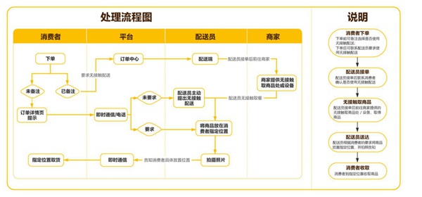 “无接触配送”由美团外卖于2020年1月26日在全国率先推出,并在随后的两个月内迅速转化为企业标准和团体标准,在全国物流配送、电商行业铺开和推进。2020年2月27日,商务部办公厅印发通知,鼓励企业广泛开展无接触配送,一些电商平台的“无接触配送”订单占总订单数比例超过80%。此次发布的国家标准《商品无接触配送服务规范》,是在美团外卖的企业标准和中国贸促会商业行业委员会发布的团体标准基础上的升级,标准共包含七部分,对无接触服务中的术语定义、服务要求、服务流程、异常情况处置和服务质量控制等方面提出了具体要求。