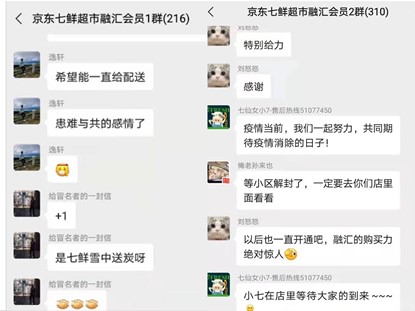 为了更及时地了解社区居民的需求,“七鲜社区微信群”也相继建立。短短一上午时间,四、五个500人大群相继加满。群内居民的声音传递着感动和鼓励,这也让七鲜超市一线员工感受到一切辛苦和坚持都是值得的。