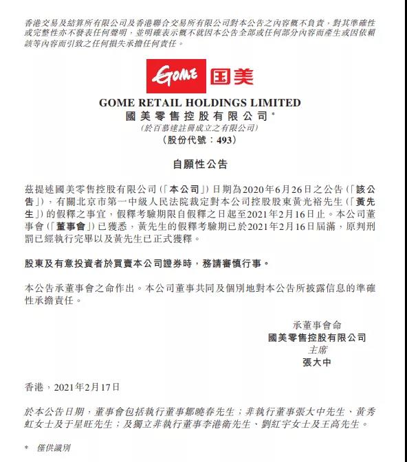 国美零售控股有限公司 (股份代码493) 自愿性公告 国美零售(00493.HK)今早公告称,就有关北京一中院裁定对公司控股股东黄光裕先生的假释的事宜,假释考验期限自假释之日起至2021年2月16日止。董事会已获悉,黄先生的假释考验期已于2021年2月16日届满,原判...