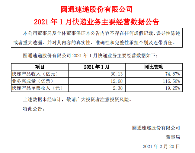龙商网消息: 圆通速递发布1月快递业务主要经营数据公告,1月快递产品收入30.13亿元,同比增长74.87%;业务完成量12.68亿票,同比增长116.56%;快递产品单票收入2.38元,同比下降19.25%。...