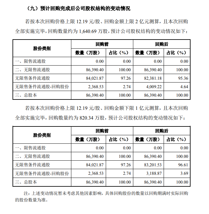 龙商网消息:步步高公告称,公司拟使用自有资金1亿元-2亿元回购公司股份,回购价格不超过12.19元/股,预计回购股份数额820.34万股-1,640.69万股,约占公司总股本的0.95%-1.9%。
