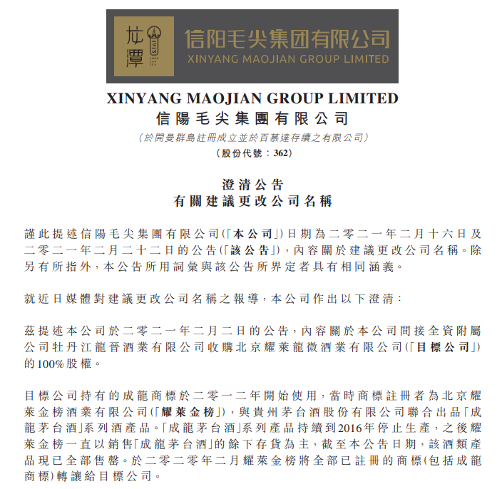 信阳毛尖在港交所公告,自2020年下半年起已从事酒类贸易业务,分别录得约港币6900万元营业额及400万元溢利,同时亦考虑茅台为国内驰名商标,为免引起误会或引起潜在法律诉讼,已补充公告说明公司采用中文第二名称“中国国龙酒业集团有限公司”。