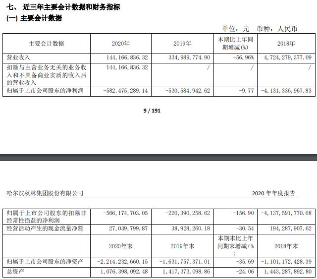 2020年,秋林集团营业收入同比大跌56.96%至1.44亿元,亏损高达5.82亿元,较2019年亏损5.31亿元扩大了9.77%,扣非净利亏损高达5.66亿元,同比扩大156.90%,归属于上市公司股东的净资产为-22.14亿元,大信所为公司2020年度财务会计报告出具了无法表示意见的审计报告。