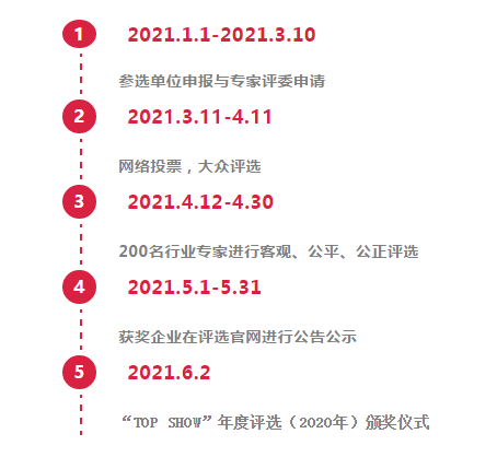 为完善“TOP SHOW” ”的评选机制,保证评选活动的广泛性、公正性、权威性,提高奖项质量,各奖项将按“一等奖”、“二等奖”、“三等奖”、“优秀奖” 的等级制度评出获奖企业。此外,评选网站将作为行业展示窗口,链接所有参评企业官网,向行业展示各企业动态,同时将作为供需平台推荐给品牌方做采购参考。各个奖项活动将最终评选出:一等奖(1名)、二等奖(2名)、三等奖(3名)、优秀奖(若干名)的荣誉。