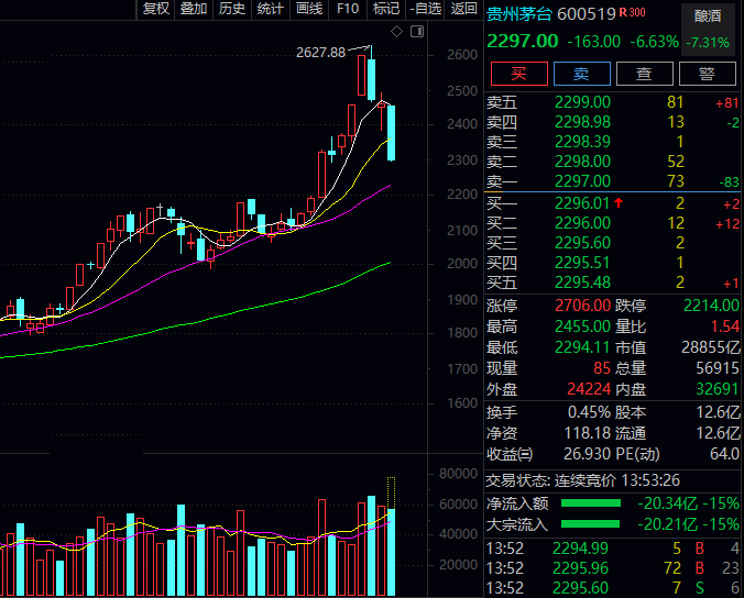 上图是白酒龙头茅台的走势,跌了超过6.6%。