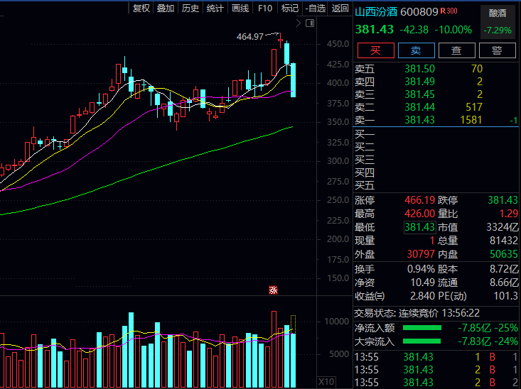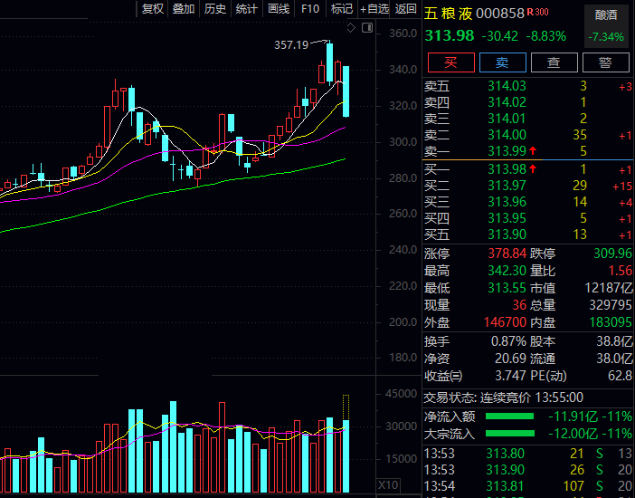 上图是五粮液的走势,跌了8.8%。(以上价格均截止1点57分)