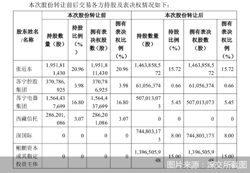 本次股份转让后,张近东持有苏宁易购的持股比例从20.96%降为15.72%,苏宁控股集团、苏宁电器集团分别持有苏宁易购0.66%、5.45%的股份。深国际与鲲鹏资本或其指定投资主体为新增股东,分别持有苏宁易购8%、15%的股份。相应的:张近东对苏宁易购拥有表决权比例也降低至15.72%。