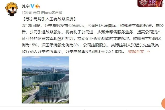 苏宁易购引入国有战略投资 张近东仍为第一大表决权股东
