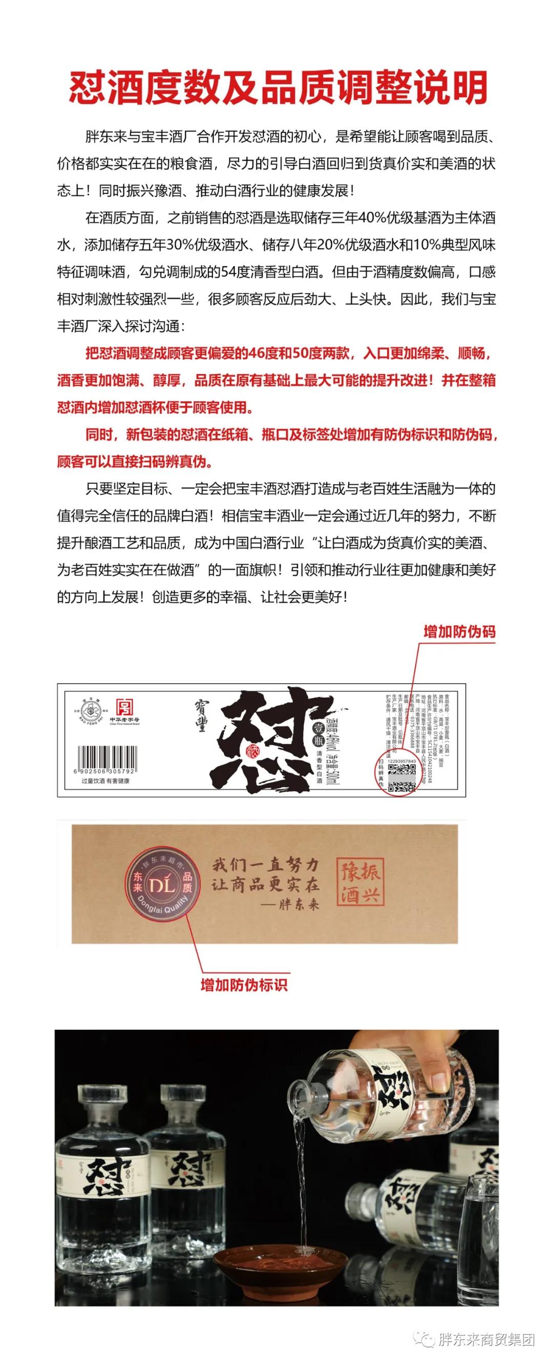 龙商网消息: 3月3日,胖东来商贸集团发布怼酒现状情况说明,怼酒将从原来的54度,调整成46度和50度两款,并且增加了防伪码,直接扫码辨别真伪。