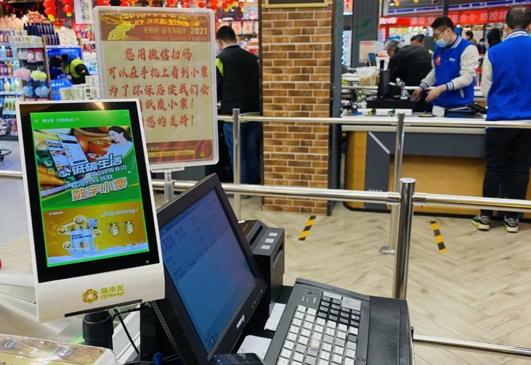 环保行动不止于此,超市发还与数衍科技达成合作,2021年2月数衍科技引领数字化和节能环保的创新解决方案——“数字小票超市解决方案”正式在超市发(学院路店)试点上线。通过部署纸电支付打印机,以数字小票代替传统纸质小票,实现收银无纸化,引导顾客绿色消费,在环保节能的同时,数字小票交易凭证便捷查看、长久保存,有效提升顾客消费体验。同时基于智能客显屏的交互设计和应用,还能在售前、售中和售后为消费者提供及时、高效的服务。