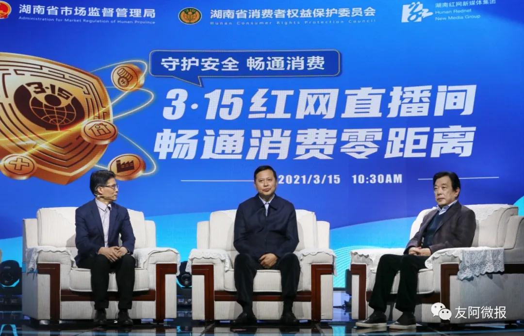 龙商网消息:3月15日上午,“3.15红网直播间”开播。湖南连锁经营协会会长、友阿公司董事长胡子敬做客直播间。此外,湖南省市场监督管理局副局长、省消费者权益保护委员会副主任李沐,红网新媒体集团总编辑贺弘联也走进了直播间。