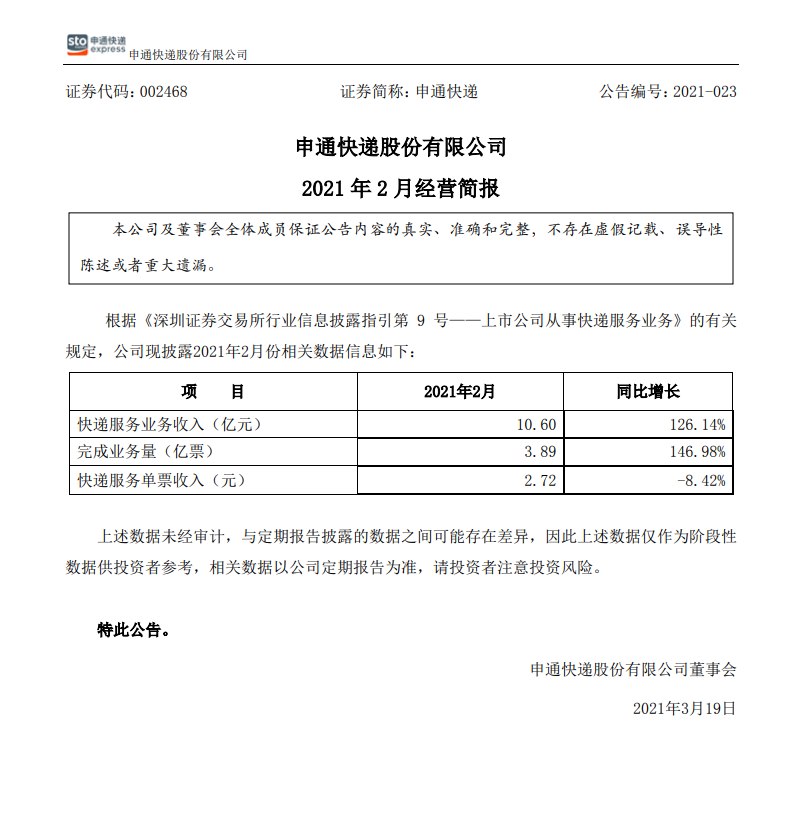 龙商网消息:申通快递公告,2月快递服务业务收入10.6亿元,同比增长126.14%;完成业务量3.89亿票,同比增长146.98%。