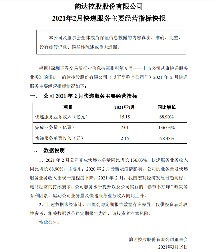 龙商网消息: 韵达股份公告,公司2月份快递服务业务收入15.15亿元,同比增长68.90%;完成业务量7.01亿票,同比增长136.03%;快递服务单票收入2.16元,同比降低28.48%。...