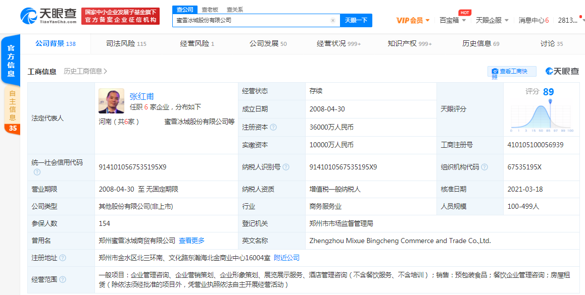 天眼查App显示,近日,蜜雪冰城股份有限公司发生工商变更,其注册资本由从约1.13亿人民币变更为3.6亿人民币,增幅约为11.11%。蜜雪冰城股份有限公司成立于2008年4月,法定代表人为张红甫,经营范围含企业管理咨询、展览展示服务、酒店管理咨询;销售:预包装...
