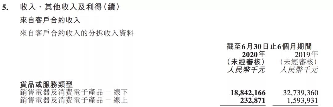 线上营收占比的相关数据——在此次年报里干脆被隐去了。但我们仍然可以从过往几期财报里得知一些信息。2018至2020年上半年,国美线上营收分别为39.4亿、20.6亿、2.3亿。2020年上半年线上营收同期跌落85.4%,仅占整体营收的1.2%。