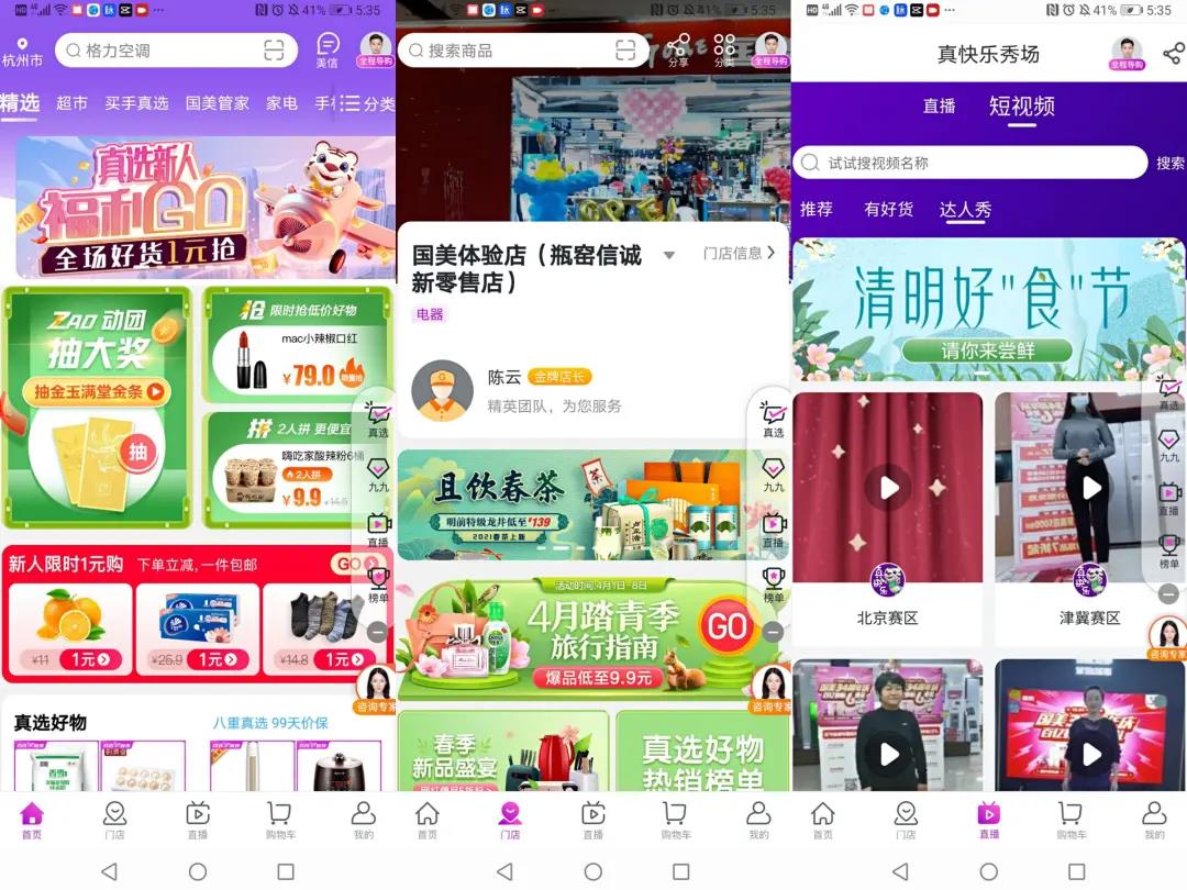 原先国美自有APP存在感不强,在猫狗拼等平台上开店是主要的线上销售渠道,而在定位确定后,供应链和物流会优先倾斜于主站。不过,从「电商在线」走访的情况来看,国美线下门店的店长目前只把真快乐APP当成一个展示商品工具。“我们成交一单,都会把客人拉到微信群里,介绍商品的时候会分享APP里面的页面,会比我直接讲解要全面。”此外,消费者在APP上拨打全程导购,可以接通真人出镜的视频导购,虽然这些连麦的真人并非是来自一线门店,而是来自总公司的工作人员。