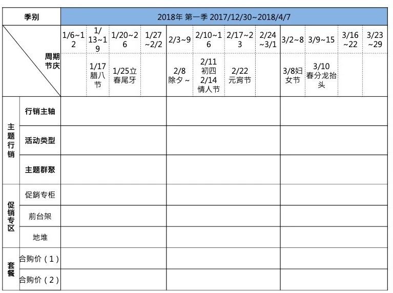 至于方案的实施落地就需要透过谈判了,既然有优惠就会有毛损及费用的发生,毛利损失怎么拆?让利是谁让?费用谁承担?厂家、总部、门市之间谁负担多少都是需要测算及预估的。另外一个关键是“是不是独家”、“有没有领先市场领先同业”,这些都是营销活动设计时需要考虑的地方。上述这些,可以简单地用表格的方式整理成季度的营销活动汇总表。