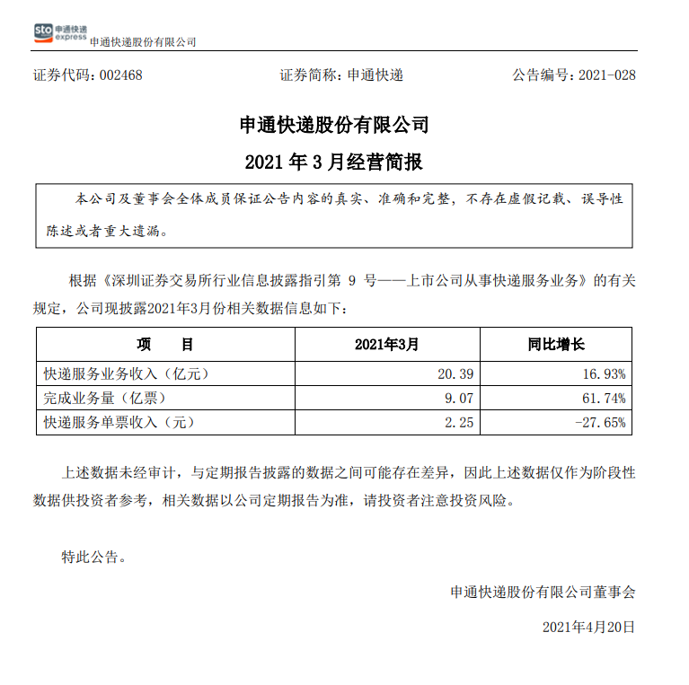 申通快递早间公告,2021年3月快递服务业务收入20.39亿元,同比增长16.93%;完成业务量9.07亿票,同比增长61.74%;快递服务单票收入2.25元,同比减少27.65%。