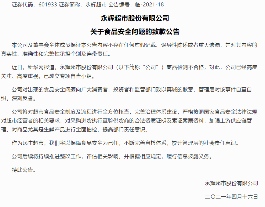 4月16日,永辉超市发布致歉公告,称公司高度重视,已成立专项调查小组。