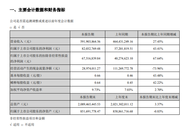盐津铺子公告称,公司一季度实现营业收入5.92亿元,同比增27.45%;净利润8203.28万元,同比增43.41%;基本每股收益0.66元。