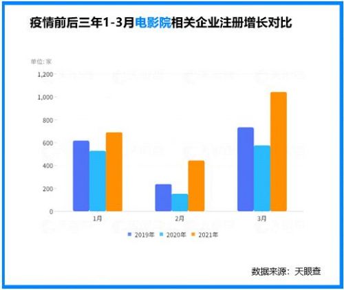 2021年春节档期间,《你好,李焕英》、《唐人街探案3》等热门电影爆红,《阿凡达》、《指环王》等经典影片的近日再映也吸引大批观众走进影院,各类热门电影的上映激起了一波又一波消费者的观影欲望。报告显示,2021年1-3月电影院相关企业注册量为2,100多家,比2020年同期同比增长73.2%,较2019年同期增长37.0%。