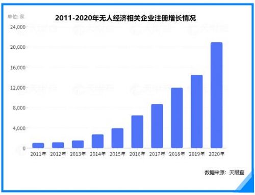 报告显示,目前我国有超过8.5万家无人经济相关企业。尤其在2020年,新增近2.1万家,为历年来新高,年同比增长45%。