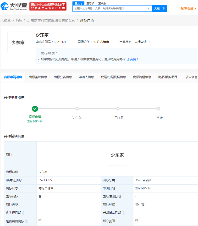 天眼查App显示,近日,京东数字科技控股股份有限公司申请注册“少东家”商标,国际分类为广告销售,当前状态为“商标申请中”。