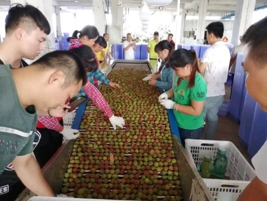 (图:位于海南陵水的苏宁家乐福荔枝直采基地,工人正在筛选分装。)