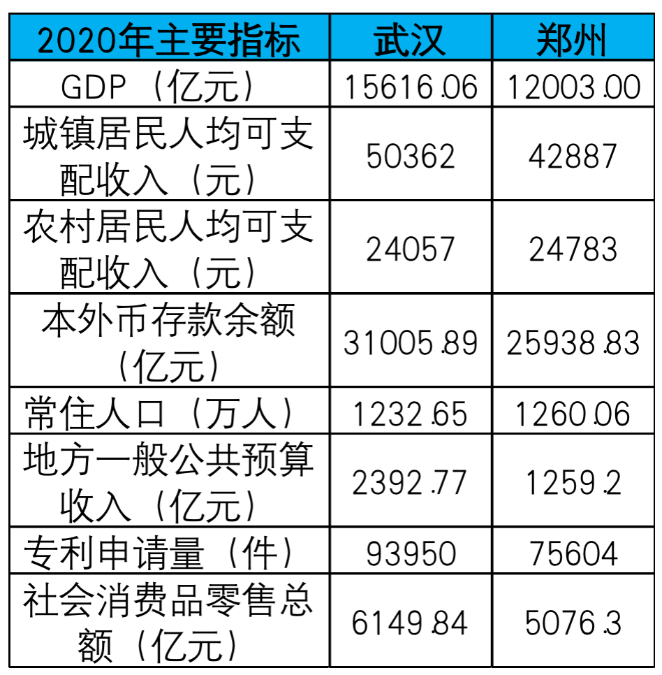 论居民可支配收入、本外币存款、地方一般公共预算收入、专利申请量、社会消费品零售总额等方面,武汉都比郑州领先一大截。
