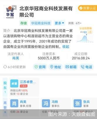 据天眼查APP显示,北京华冠商业科技发展有限公司是一家以连锁购物中心和连锁超市为主营业态的商业企业,其主体为北京华冠商业,北京华冠商业科技对外投资了包括涿州市华冠超市有限公司、北京燕鑫华冠商贸有限公司等6家公司。