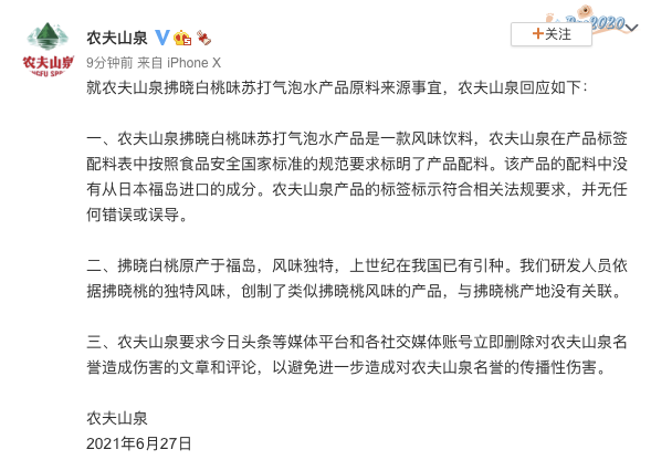 就拂晓白桃味苏打气泡水产品原料来源事宜,农夫山泉6月27日上午在其官方微博回应称,农夫山泉拂晓白桃味苏打气泡水产品是一款风味饮料,农夫山泉在产品标签配料表中按照食品安全国家标准的规范要求标明了产品配料。该产品的配料中没有从日本福岛进口的成分。农夫山泉产品的标签标示符合相关法规要求,并无任何错误或误导。
