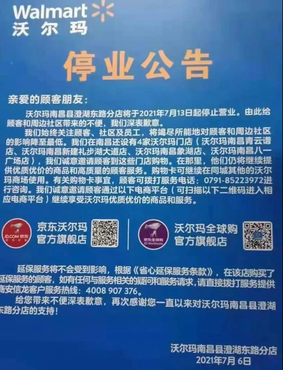 7月6日,沃尔玛南昌县澄湖东路分店贴出公告宣布,门店将于7月13日起停止营业,闭店原因未披露。该店关闭后,沃尔玛在南昌还有4家大卖场在运营,分别是青云谱店、新建礼步湖大道店、象湖店和八一广场店,同时还有1家山姆会员店。