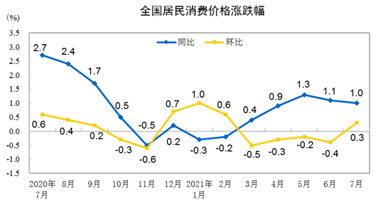 国家统计局消息,2021年7月份,全国居民消费价格同比上涨1.0%。其中,城市上涨1.2%,农村上涨0.4%;食品价格下降3.7%,非食品价格上涨2.1%;消费品价格上涨0.6%,服务价格上涨1.6%。1??—7月平均,全国居民消费价格比去年同期上涨0.6%。7月份,全国居民消费价格环比上涨0.3%。其中,城市上涨0.3%,农村上涨0.2%;食品价格下降0.4%,非食品价格上涨0.5%;消费品价格上涨0.1%,服务价格上涨0.6%。