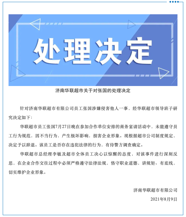 8月9日晚18时,济南华联超市微信公众号发出官方消息:针对济南华联超市有限公司员工张国涉嫌侵害他人一事,根据超市公司制度规定,决定予以辞退。该员工是否存在违犯法律的行为,有待警方调查确定。