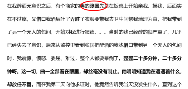 而在阿里女员工的网络自述中,自己最开始被恶意灌酒、带到无人包间猥亵的就是一名叫“张国”的济南华联商户。