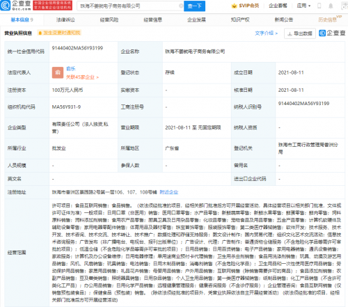 企查查APP显示,8月11日,珠海不姜就电子商务有限公司成立,法定代表人为俞乐,注册资本100万元人民币,经营范围包含:食品互联网销售;食品销售;第二类医疗器械销售;软件开发等。