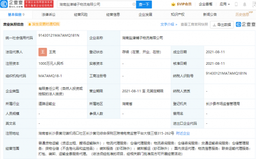 企查查APP显示,8月11日,湖南盐津铺子物流有限公司成立,法定代表人为王亮,注册资本1000万元人民币,经营范围包含:普通货物运输、物流代理服务、仓储管理服务、国内货运代理等。