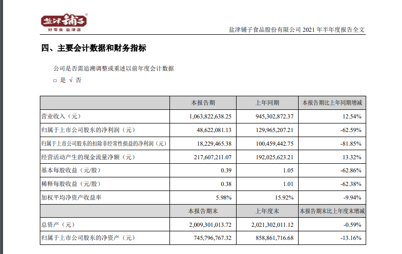 盐津铺子发布2021年半年度报告。报告显示,盐津铺子上半年营收10.64亿元,同比增长12.54%;净利4862.2万元,同比下降62.59%;基本每股收益0.39元,同比下降62.86%。