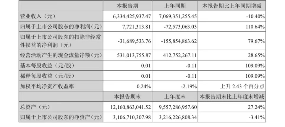 根据公告,公司实现营业收入63.34亿元,同比减少10.4%;归属于上市公司股东的净利润772.13万元,去年同期为亏损7257.3万元,同比扭亏为盈。
