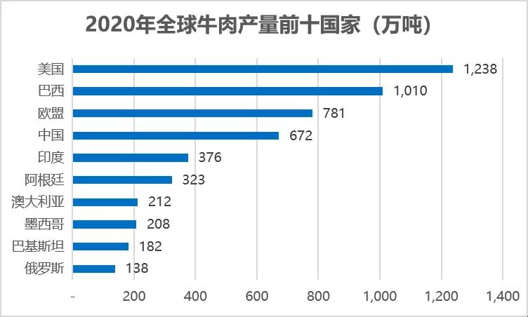 美国、巴西、欧盟目前是世界上牛肉生产量前三的国家(地区),合计生产了全球约50%的牛肉。中国目前为世界第四大牛肉生产国。