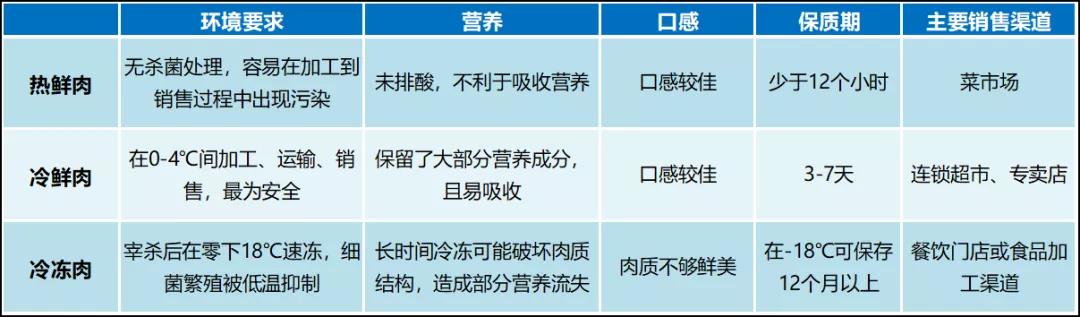 生肉商品以热鲜肉、冷鲜肉、冷冻肉的三种形态进行流通销售。冷鲜肉相对不易滋生细菌,在经过冷却排酸后口感鲜嫩,更加受到消费者的喜爱和欢迎。由于传统菜市场缺乏低温保鲜设备,热鲜肉的销售形式在我国低线城市和村镇依然广泛存在。未来随着生猪调运受限成为常态,冷鲜肉销售形式的占比预计将会继续提升。